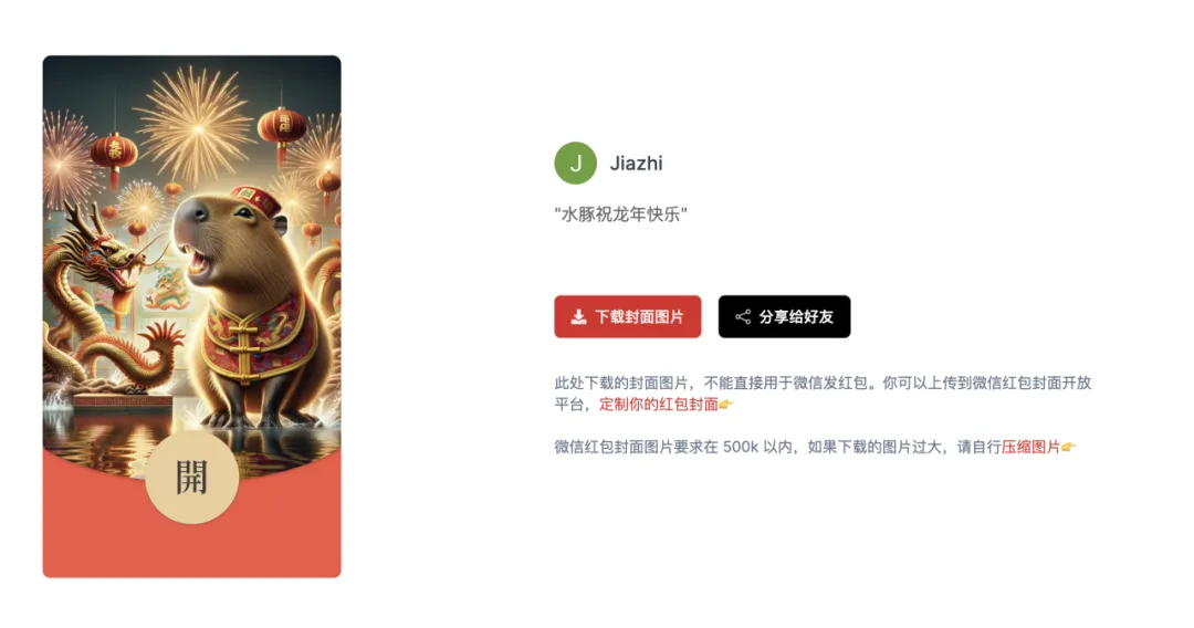 我还接触到一位制作了 AI 红包封面平台的开发人员。在他的平台上,不需要另买账号,直接输入提示词,就能生成一张已经匹配好格式的红包封面。如果说 Nooo 们是个体户,这位叫 idoubi 的前腾讯高级工程师就是 AI 红包的批发商——不过只负责画画那步,审核之后的工序还是得用户自己来。