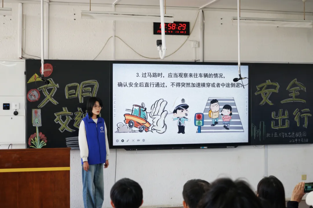 随后,“软小蓝”大学生志愿服务团成员夏青、邵熙瑞、刘彦彤依次登台,分别围绕驾车安全、行人安全、乘车安全三大板块,开展了生动详实的交通安全宣讲。成员们结合真实案例与科普知识,细致讲解了驾车时遵守交通信号、规范操作的重要性;提醒行人出行需走人行道、过马路集中注意力,杜绝分心行为;明确了乘车“四要四不要”准则,强调儿童安全座椅、规范系安全带等关键要点,用通俗易懂的语言,将交通安全知识传递给每一位在场师生。