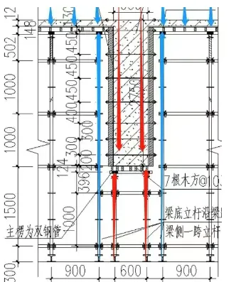 梁底单独设置立杆承受梁荷载 板底单独设置立杆承受板荷载 荷载传递路径清晰明确 适用于超限梁支撑(线荷载≥20kN/m) 最安全的支撑方式,但材料用量较大