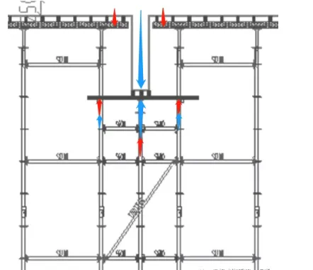 [示意图:梁底回顶单根立杆,荷载部分传递至板底立杆]