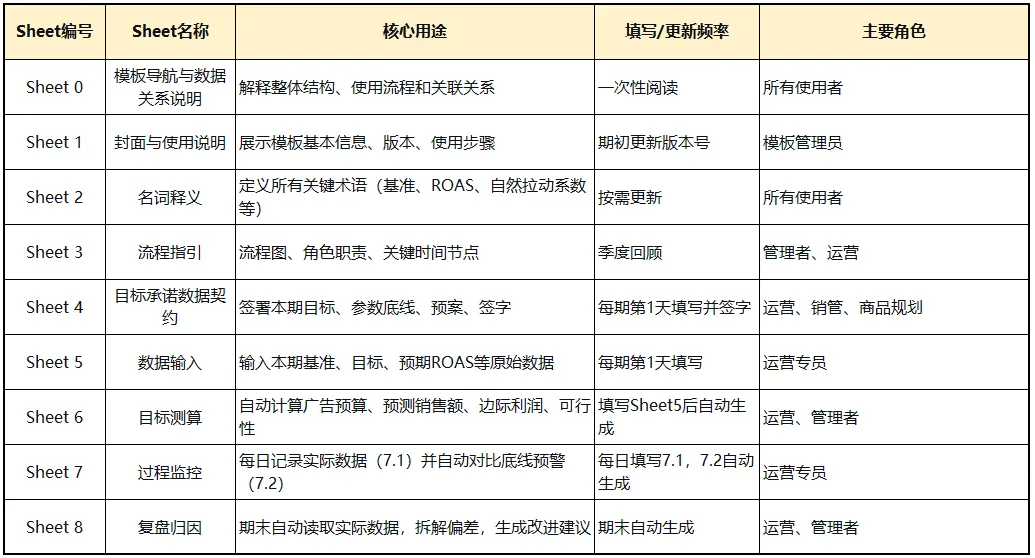3. 团队根据Sheet 8的结论,讨论下期目标优化方向(如调整ROAS预期、加大关键词投入等)。