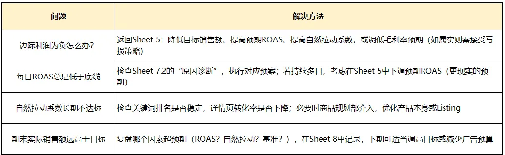 3. 若出现红色预警(如ROAS低于底线),根据Sheet 7.2“触发动作”列的建议,在24小时内执行预案(如否定无效词、调整出价、关键词卡位等)。
