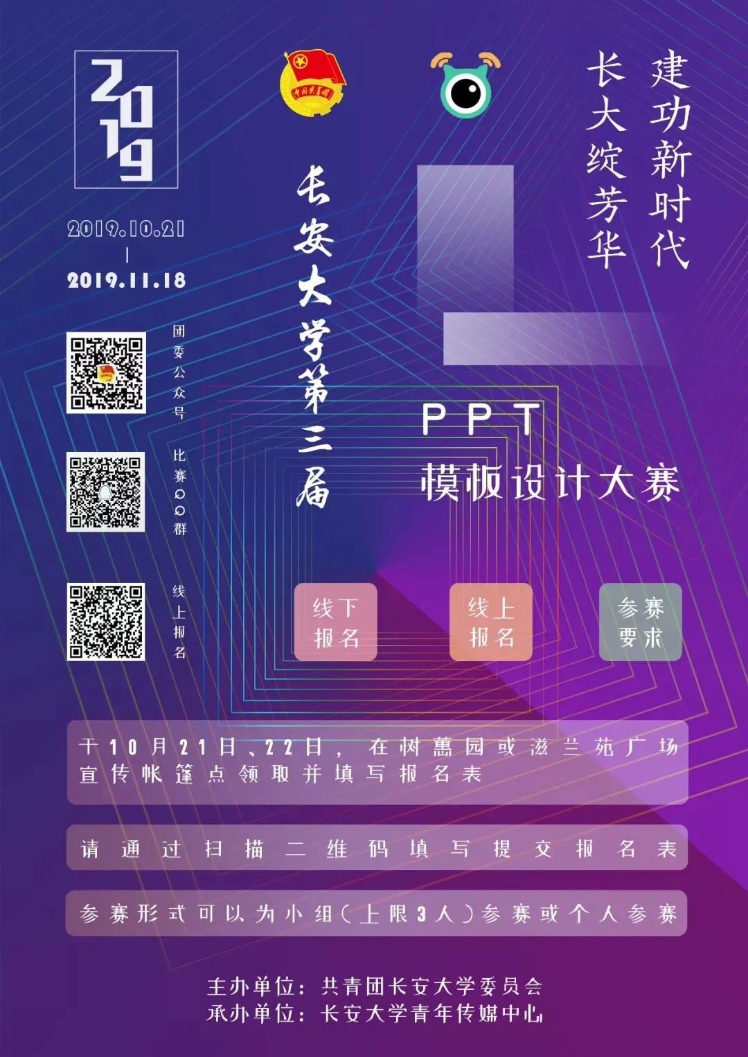 “建功新时代,长大绽芳华”2019年长安大学第三届校园PPT模板设计大赛为你而生。本次活动旨在提升当代大学生的PPT操作水平,培养创新意识和独立思考的能力,展现长大学子的精神面貌和创新创意,体现中国特色社会主义新时代的时代特征,不忘初心、牢记使命,砥砺前行。