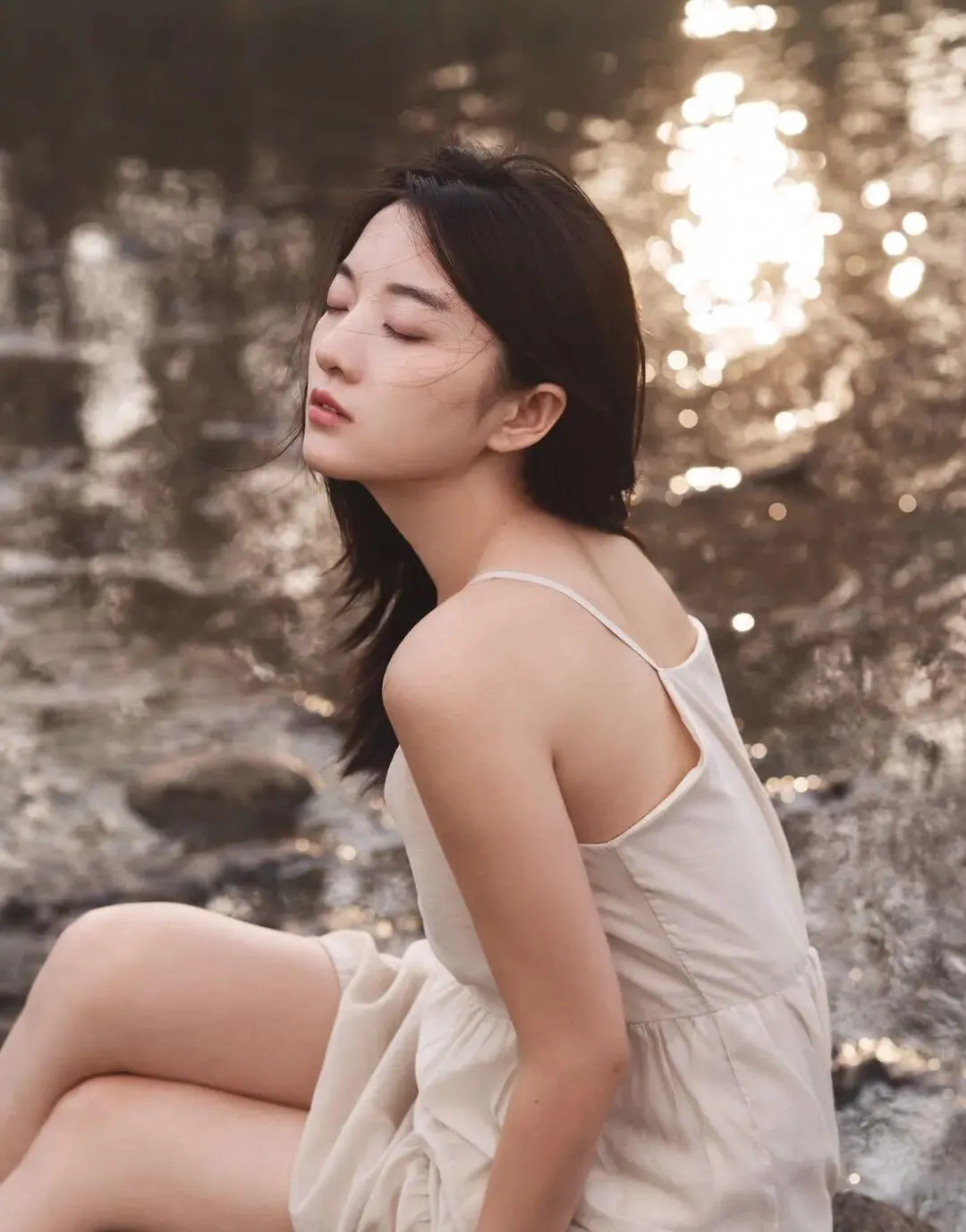 如果是在水边、草地边这种偏自然的场景,可以试试侧坐下来。双腿自然屈起,身体微微转向一边,手放在身后轻撑一下,背不要塌,脸轻轻抬起,闭上眼或者半眯着眼都很温柔。这个动作很能突出肩颈和手臂线条,也会让腰背显得更挺拔,整个人看起来特别有气质。照片会有一种被风轻轻吹过的柔软感,特别适合白裙子。