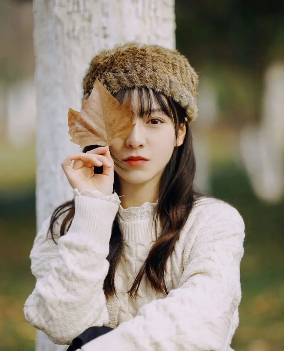 秋冬或公园场景里,道具真的很好用,一片落叶就够了。把叶子举到一只眼睛前,不要完全挡死,手指轻轻捏住边缘,另一只眼自然看向镜头,嘴角放松就好。这样拍能让画面立刻有重点,脸也会显得更精致,五官更加集中。整体感觉俏皮里带一点文艺,很适合想拍出氛围感气质感的女生。