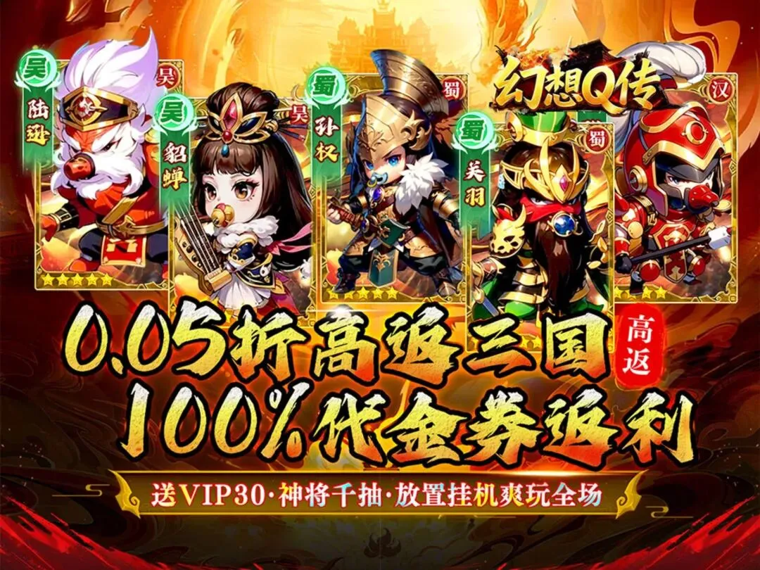 幻想Q传(0.05折三国毕业版)1、★★【0.05折扣充值】全场永久充值0.05折,历史名城,经典战役,三国名将;2、★★【红包商店】游戏内可获取大量红包道具,兑换充值货币和实充代金;3、★★【满级VIP】连续登录10天送满级VIP30,海量元宝,丰富道具,海量英雄经验;4、★★【无限红包】新角赠送“无线红包”道具,开启后可获取充值货币;5、★★【千抽福利】通关主线关卡,领取千抽名将令;