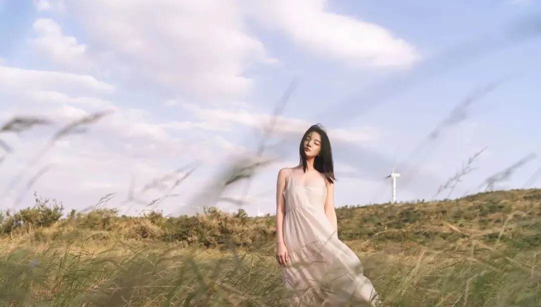 如果是在水边、草地边这种偏自然的场景,可以试试侧坐下来。双腿自然屈起,身体微微转向一边,手放在身后轻撑一下,背不要塌,脸轻轻抬起,闭上眼或者半眯着眼都很温柔。这个动作很能突出肩颈和手臂线条,也会让腰背显得更挺拔,整个人看起来特别有气质。照片会有一种被风轻轻吹过的柔软感,特别适合白裙子。