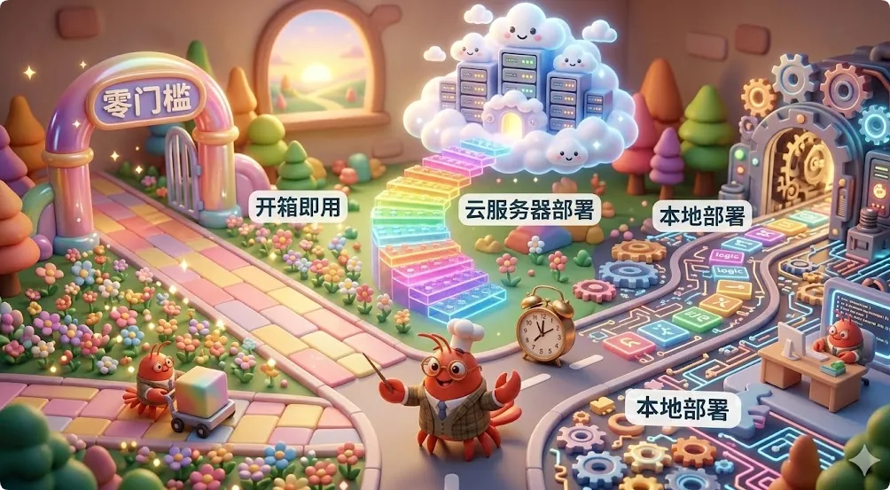 先去第三方平台体验(方案一),确认OpenClaw确实能解决你的问题 确认有用之后,租个云服务器自己部署(方案二) 等玩熟了,再考虑本地部署(方案三)