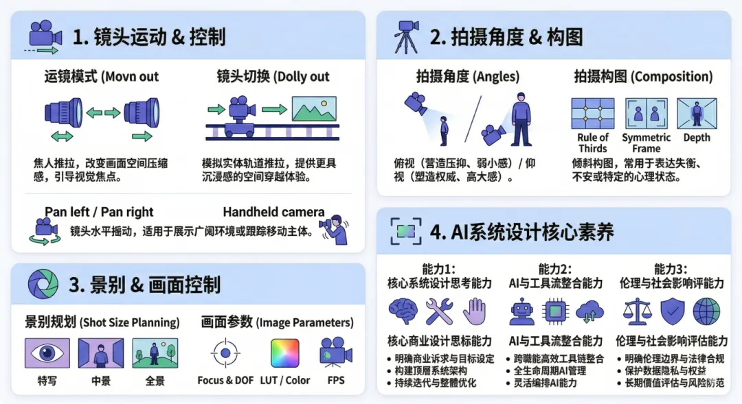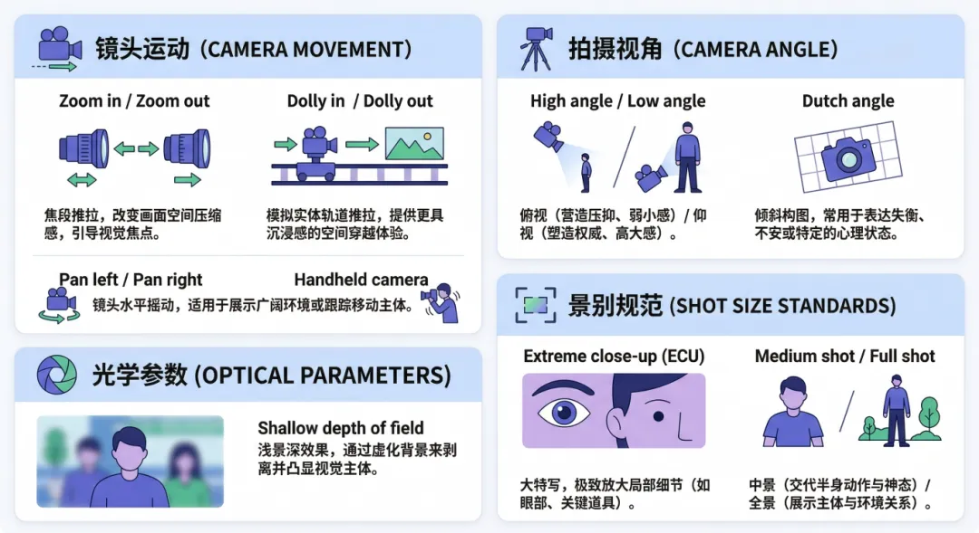 为提升生成的准确率,实操中常使用标准的英文影视术语进行提示词(Prompt)干预。以下为核心运镜与景别控制参数参考: