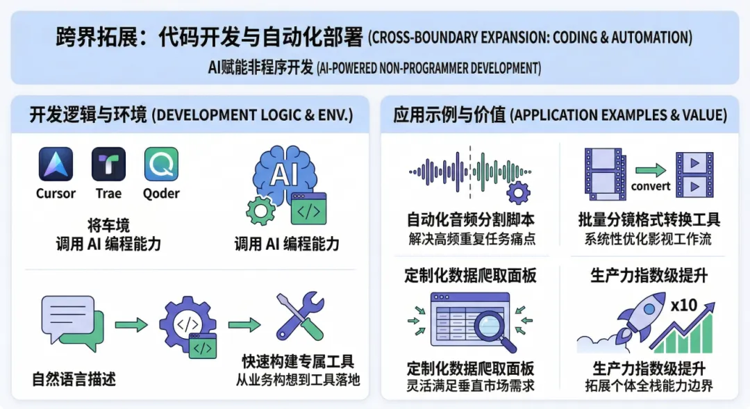 借助 Cursor、Trae 等集成AI编程助手的开发环境,结合底层大模型能力,从业者可以通过自然语言描述业务逻辑,快速构建专属的效率工具。例如:自动化音频分割脚本、批量分镜格式转换工具、或是定制化的数据爬取与清洗面板。这种跨界开发能力,使个体能够针对自身工作流中的重复性痛点,进行精准的系统性优化,实现生产力的指数级提升。