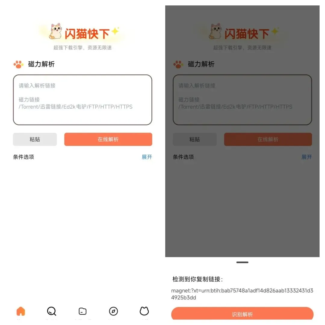 它支持一大堆我听过的、没听过的链接格式,比如磁力链、迅雷链什么的。你根本不需要研究哪个链接对应哪个软件,只需要复制链接,然后打开这个App,它自己就能识别并开始解析,整个过程非常自动化。