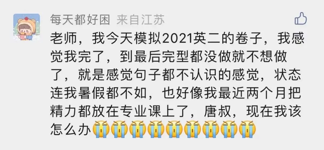 你好,每天都好困同学。最后的复习阶段重心向专业课倾斜是可以的,英语复习兼顾到,要保证不要停下哦。如果因为专业课占用时间可以理解,但一定一定不要因为怕错题而不做题。最好的办法就是直接面对,自己哪个题型错的多,就集中练习哪个题型,一定会有效果的。