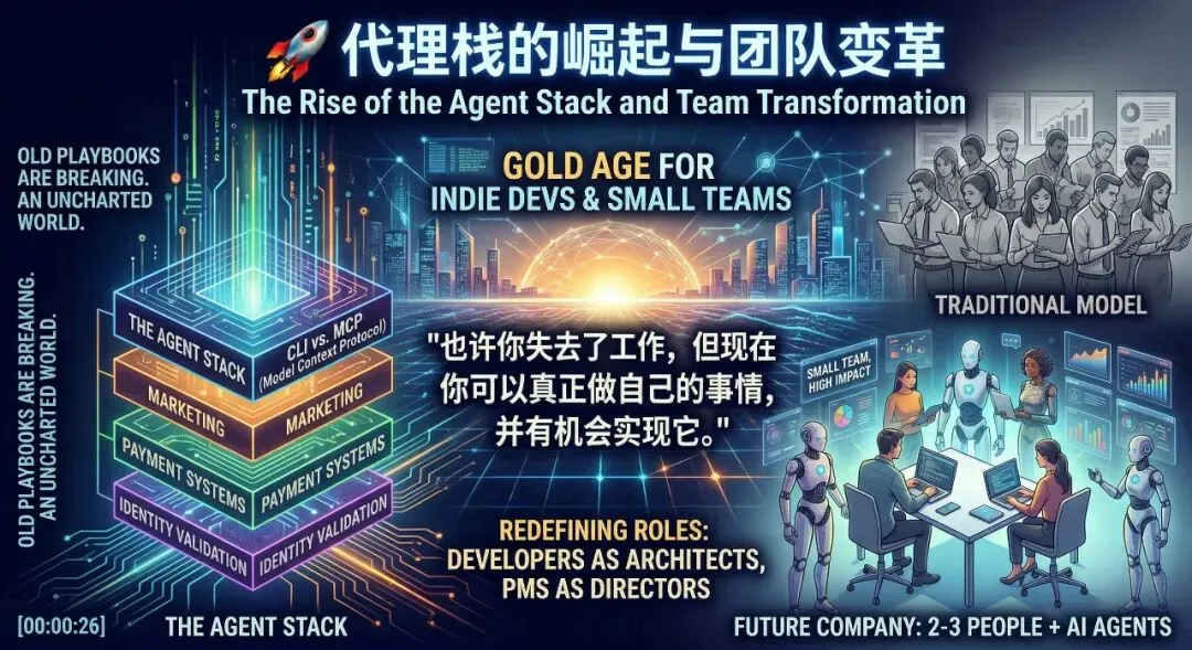 随着 AI 代理技术的成熟,整个代理栈正在迅速涌现。身份验证、支付系统、市场营销,甚至是命令行界面与模型上下文协议(MCP)的对比,这些都是前所未有的新事物。Peter 指出,旧的剧本正在失效,我们正进入一个完全未知的世界。传统的开发模式和管理经验可能不再适用,开发者需要重新学习如何与智能体协作。