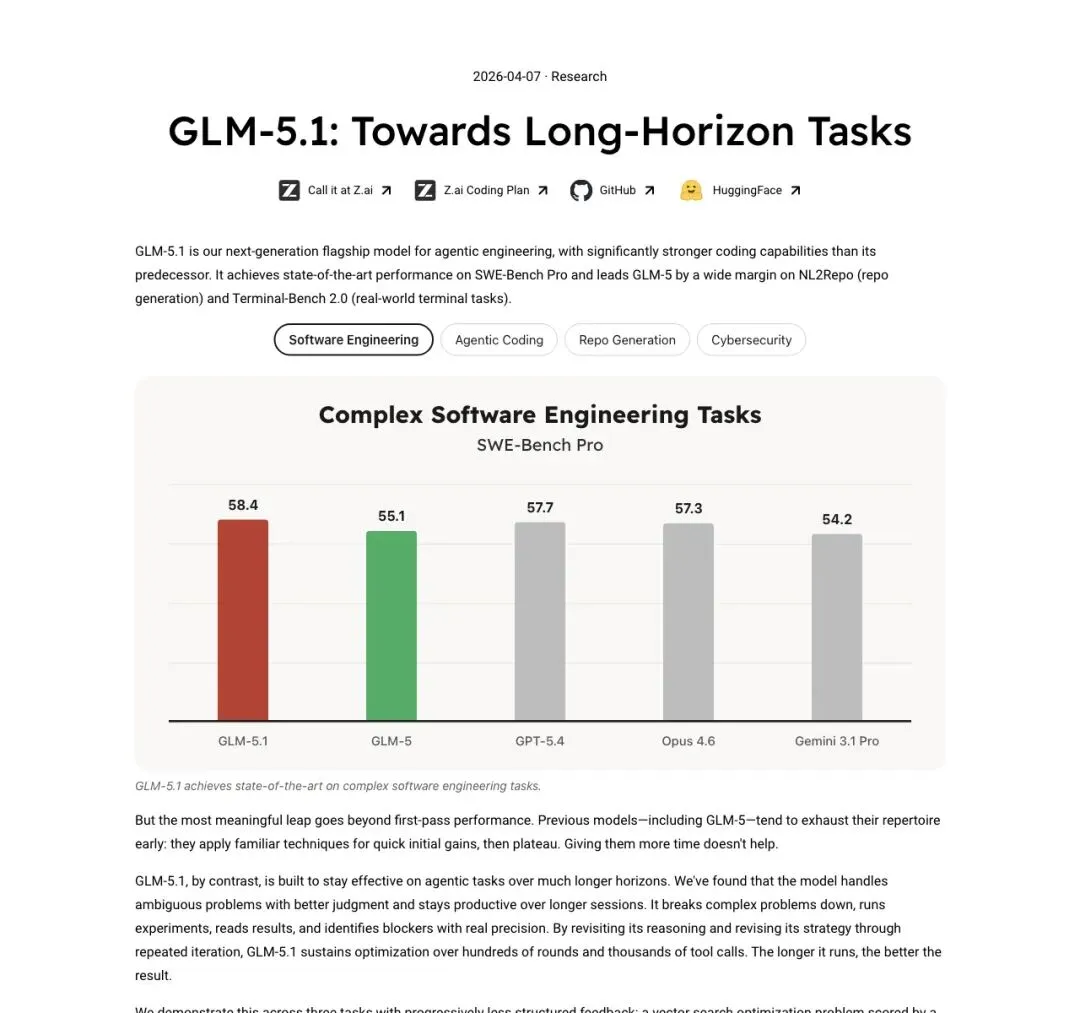 4月7日,Z.ai官方博客悄悄上线了一篇文章——标题很克制:《GLM-5.1: Towards Long-Horizon Tasks》。