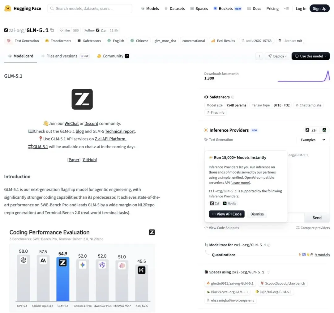 ▲ Hugging Face模型卡:GLM-5.1,754B参数,MIT协议