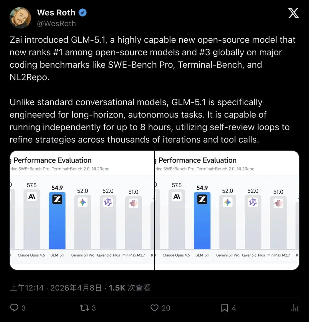 ▲ Wes Roth评价GLM-5.1:专为长周期自主任务设计,能独立运行8小时