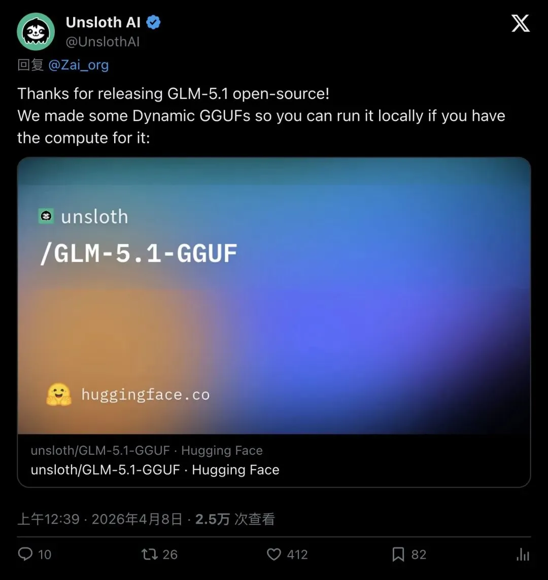 ▲ Unsloth火速跟进,提供GLM-5.1 GGUF动态量化版本