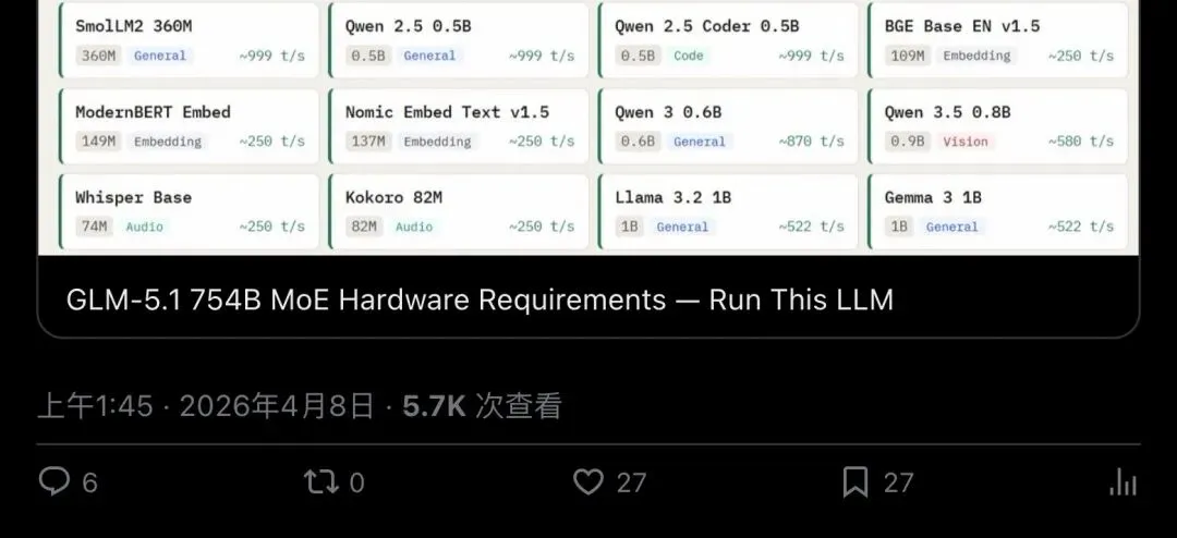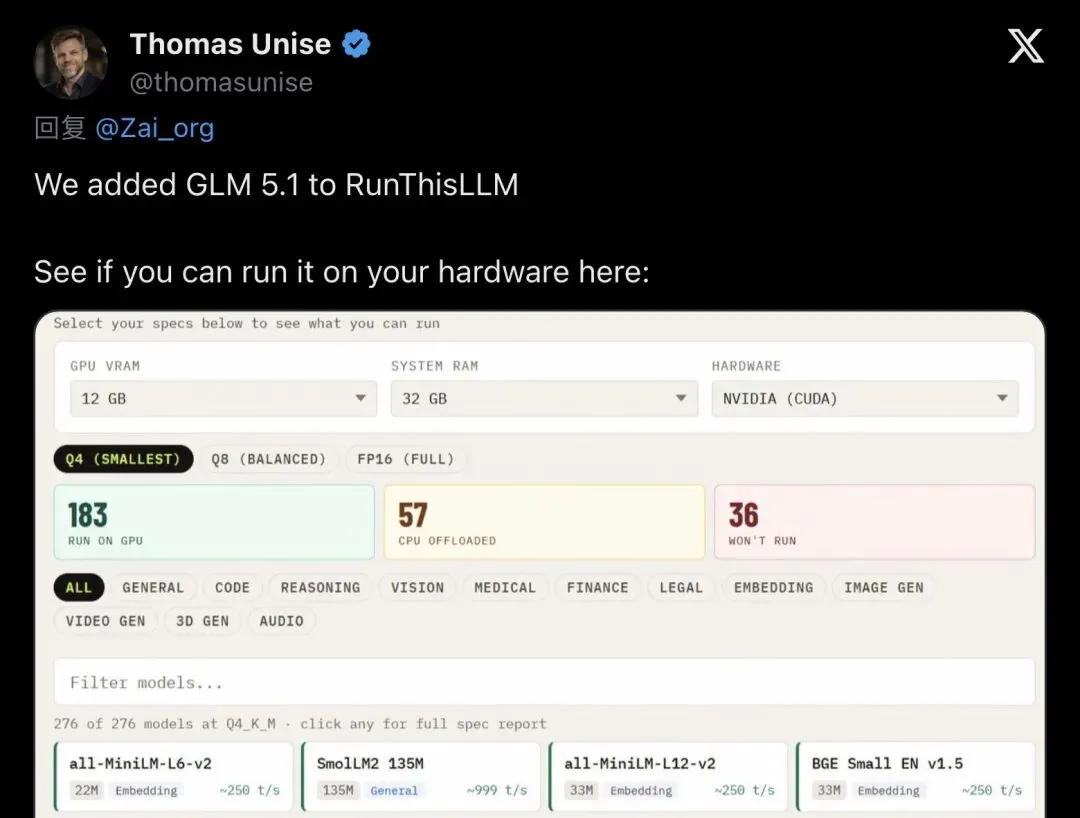▲ RunThisLLM加入GLM-5.1:754B MoE的硬件需求一目了然