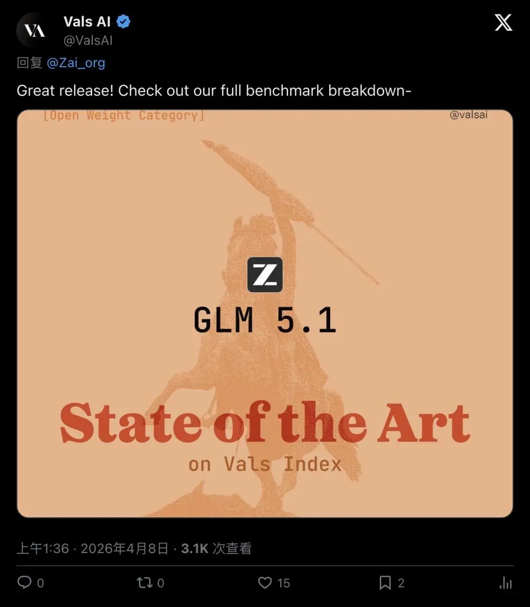 ▲ Vals AI将GLM-5.1评为开放权重类别的State of the Art