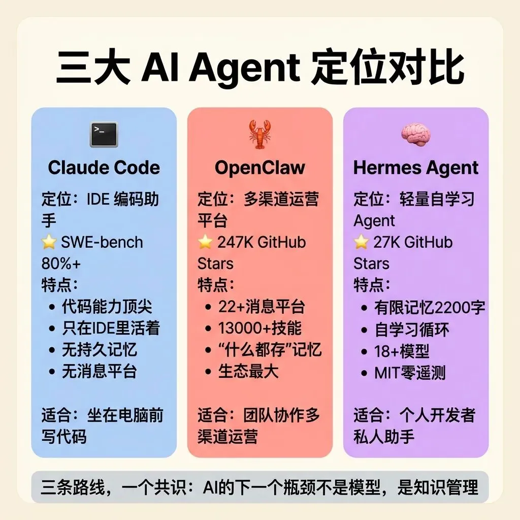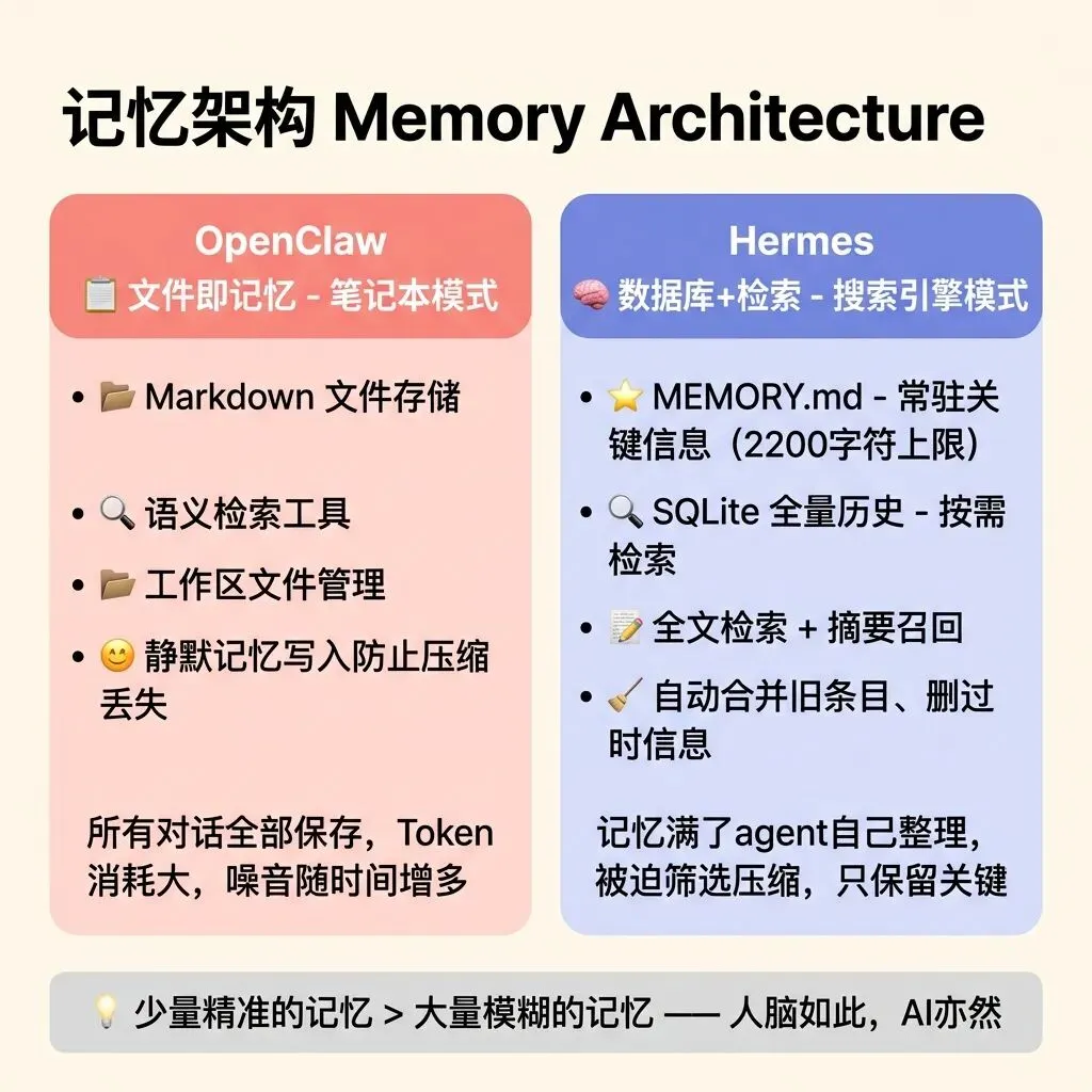 ❌ 不需要换:如果你觉得现在的 Agent 已经完全够用,不需要折腾。 🌍 选 OpenClaw:如果你想要一个生态庞大、“多渠道集成之王”,能一拖二十地搞联运。 🧠 选 Hermes:如果你真正需要的是一个长期进化的大脑分身,喜欢它随着你的习惯变得敏锐、节省和高效。