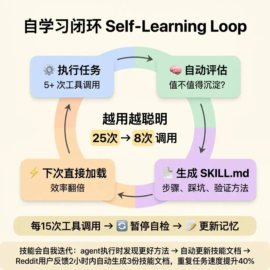 第一阶段(执行):它跌跌撞撞花了 25 次工具调用帮你完成了一个复杂任务。 第二阶段(反思):它会进入“静默思考”,总结这次踩坑经历了什么。 第三阶段(沉淀):它会把最优解自动编写成一张 .md技能卡片。下次遇到同类任务,直接照着最佳实践走。