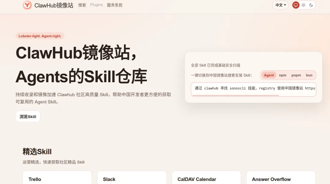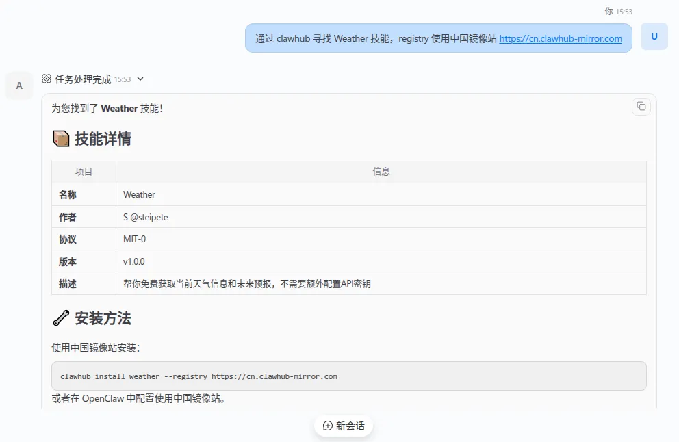 国内镜像站ClawHub不到一分钟就可以获取到用户查询的技能详情