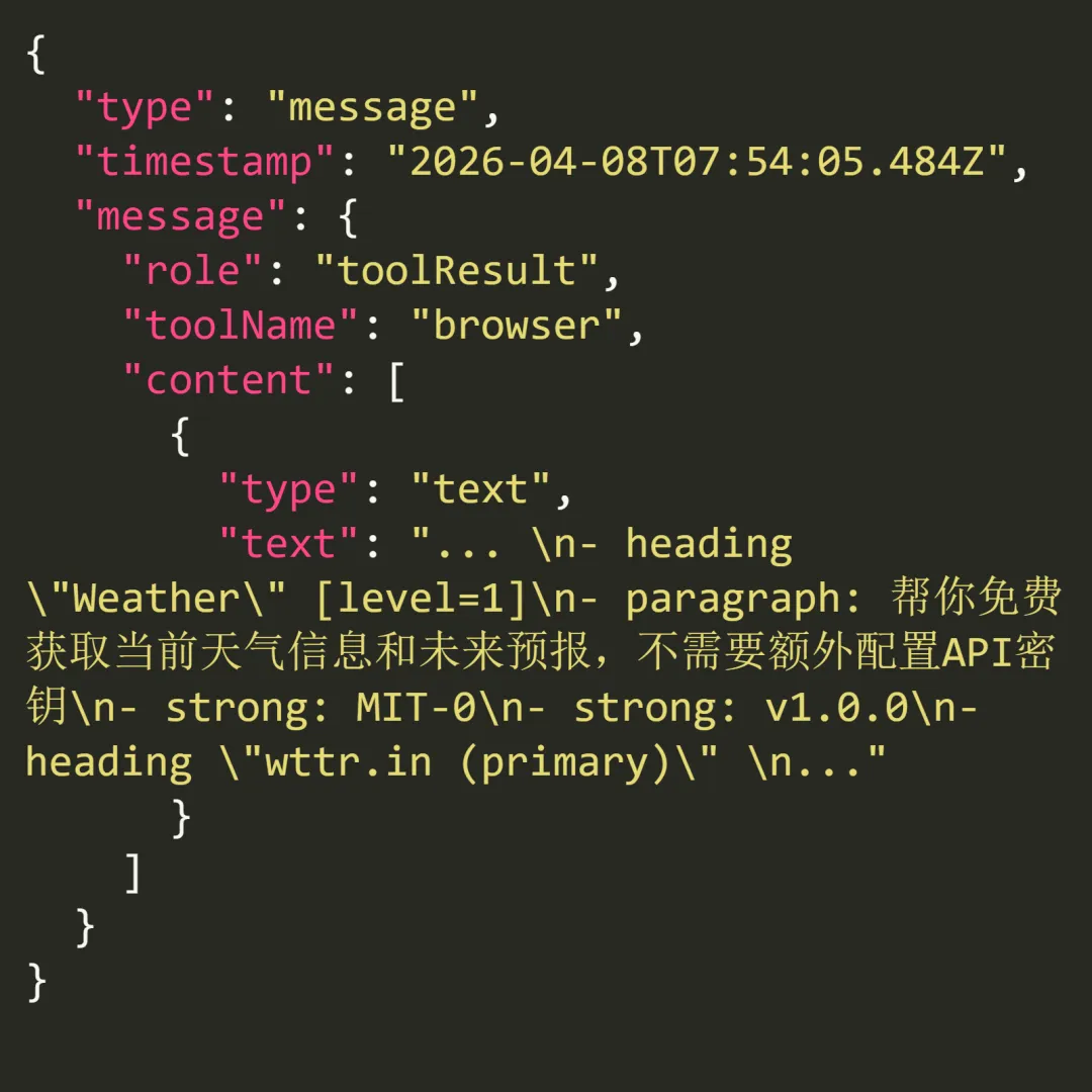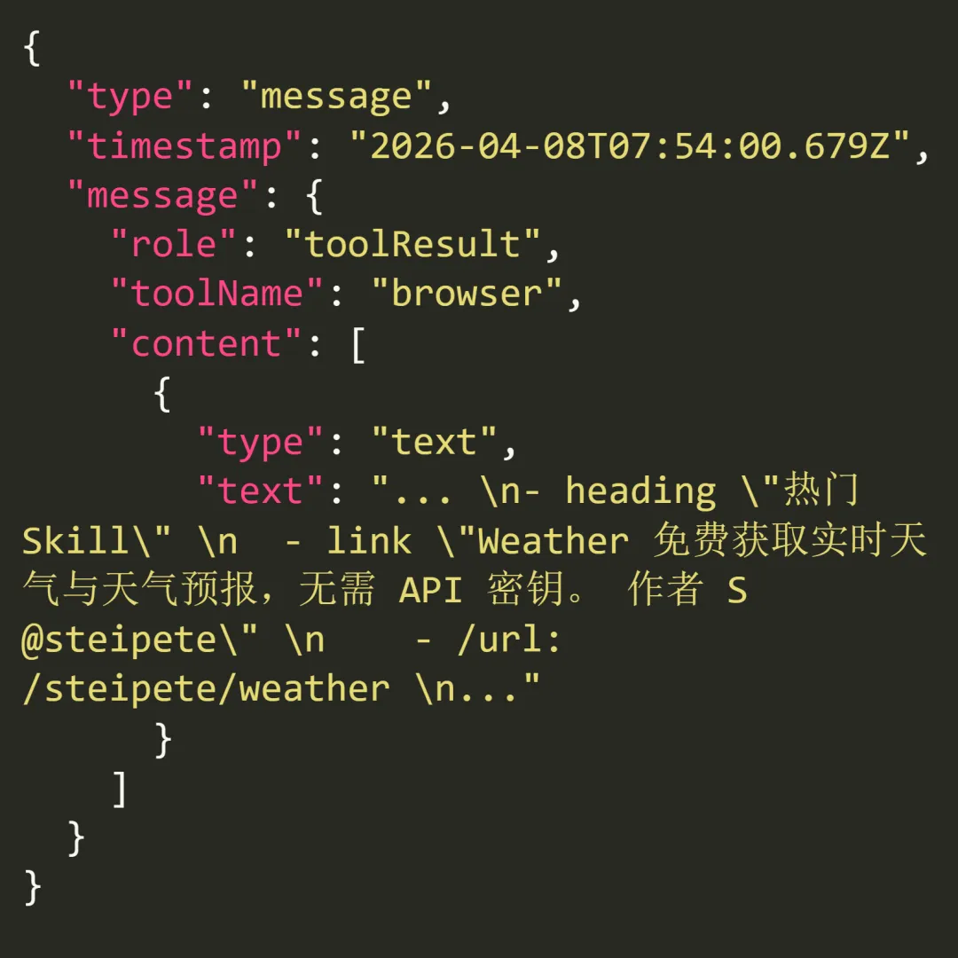 Agent通过snapshot动作读取页面DOM树,由于是国内节点,庞大的页面元素在1.5秒内即完成抓取并返回,Agent成功在热门Skill中发现了Weather技能。