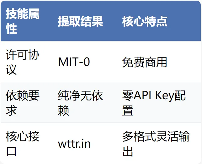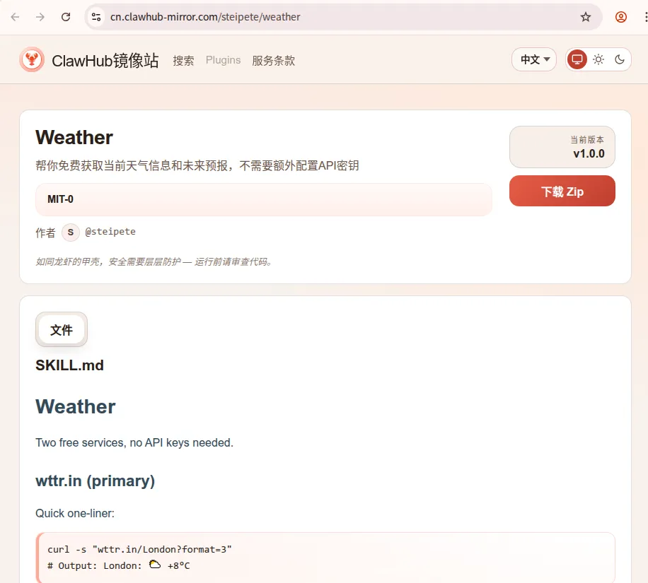 这个Weather技能由开发者@steipete编写,核心功能是帮助用户免费且免API密钥地获取当前天气与未来预报。