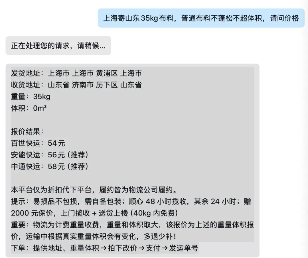 客户: “北京到长沙,一个冰箱,80kg,体积大概1.5立方,帮我算一下最便宜的。”