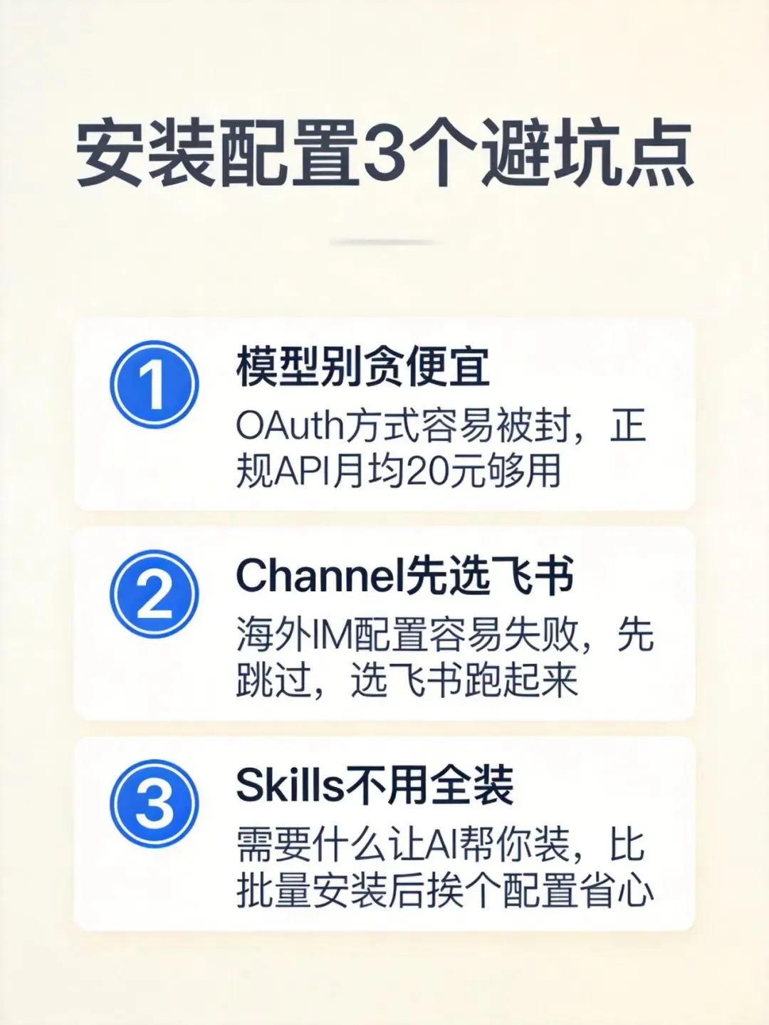 关于 Channel 配置。 如果你选了一些海外 IM 工具,配置过程中很容易遇到网络问题导致 Gateway 启动失败。解决方案很简单:先跳过,选一个国内渠道(飞书是现成的选择),先跑起来再说,后续再调整。
