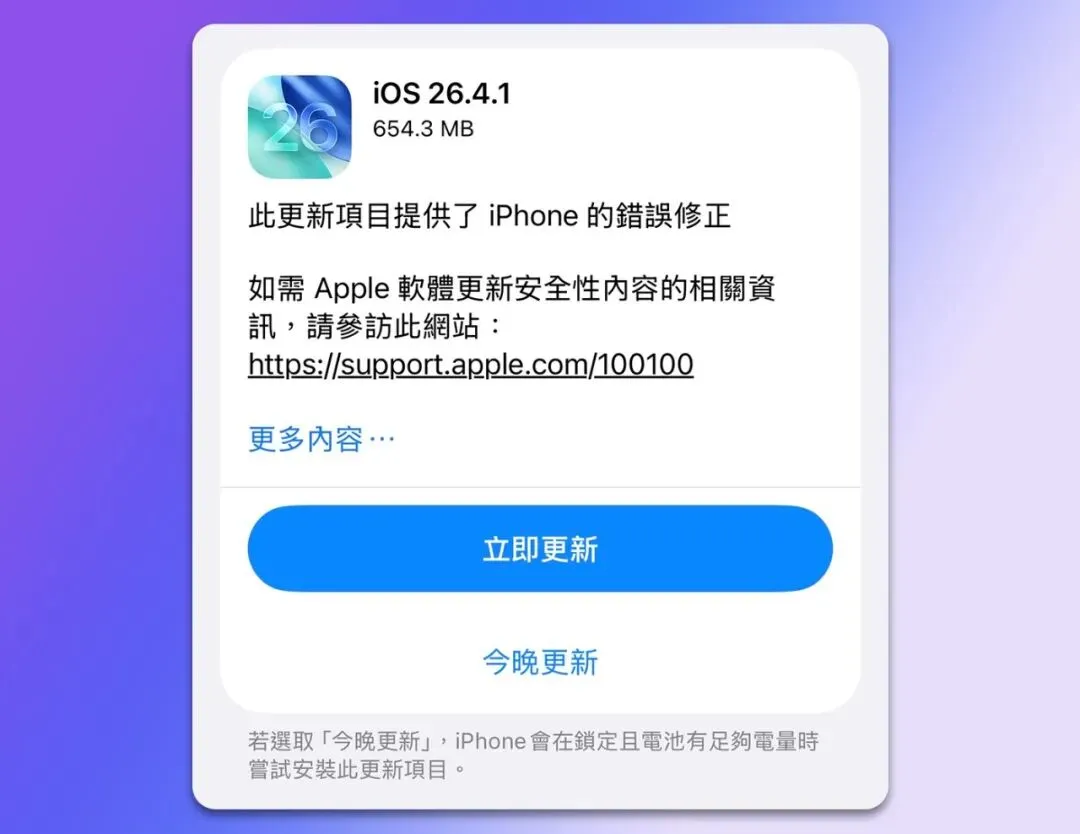 今天凌晨,苹果向用户推送了 iOS 26.4.1 和 iPadOS 26.4.1 正式版系统,版本号为:23E254,距离上个正式版仅间隔两周多时间。