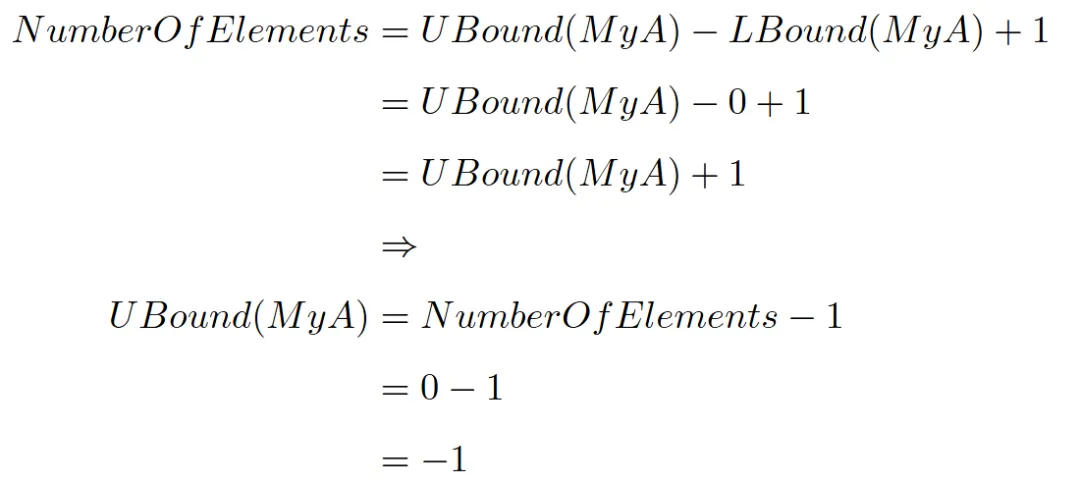 首先声明 MyA 是一个 Variant 类型的动态数组,然后使用 Array() 构造一个数组返回给 MyA。第 5 行的结果是 0, 5,说明 MyA 的下界是 0,上界是 5,共有 6 个元素,这 6 个元素都是变体(Variant)类型。第 6 行的结果是 Variant(),说明 MyA 是一个变体类型的数组。第 7 行的结果是 8204,因为 8204 = 8192 + 12,8192 是 vbArray 的类型代码,12 是 vbVariant 的类型代码,所以 8204 就表示一个元素类型是 Variant 的数组。Dim MyA() As VariantMyA = Array()Debug.Print LBound(MyA) & ", " & UBound(MyA)