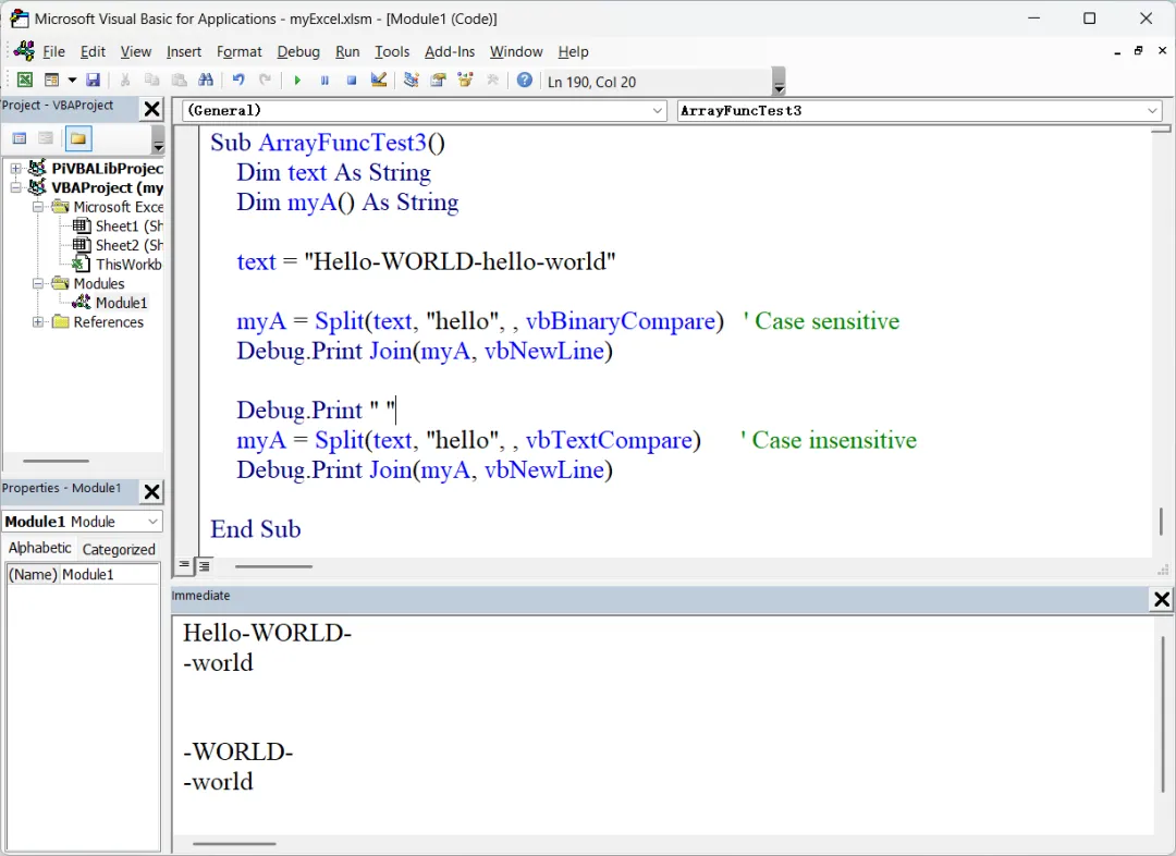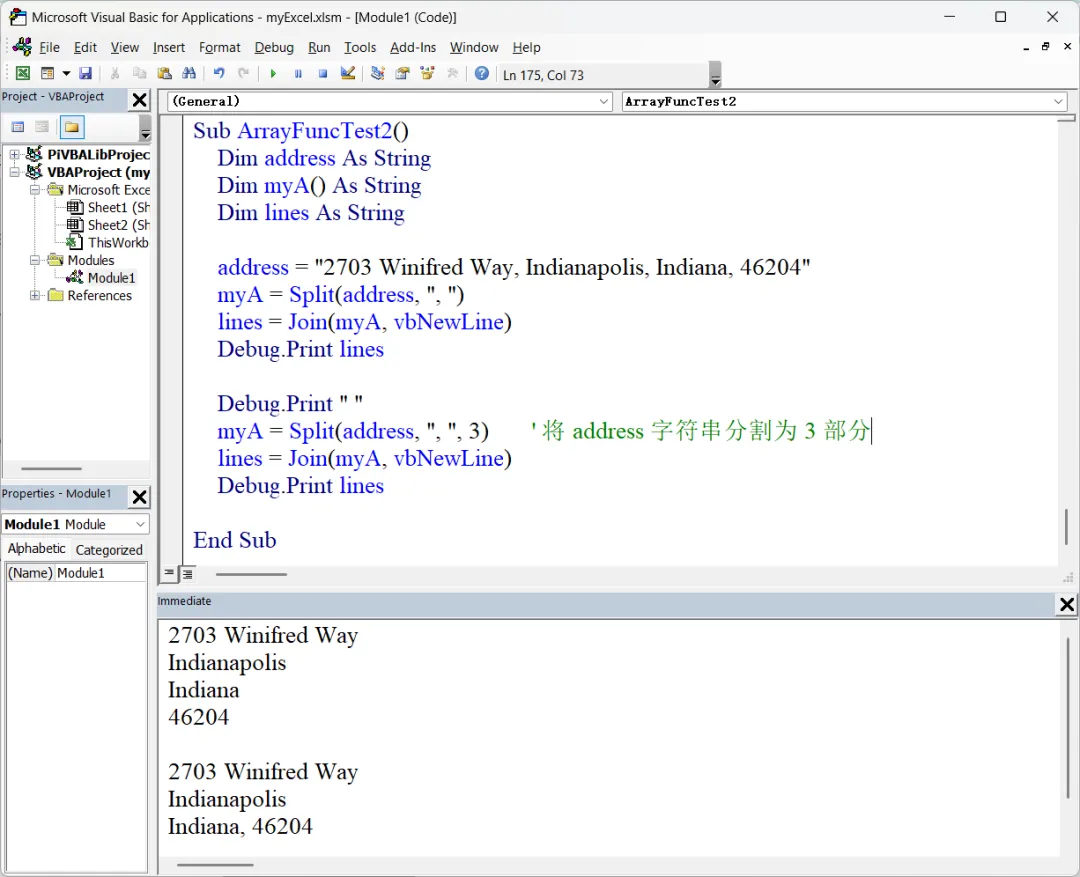 这个例子演示了 Split 和 Join 的组合作用,将一个单行的地址字符串分割为由换行符分隔的多行地址字符串。这个例子同时也演示了 limit 参数的作用:省略 limit 参数时,Split 返回所有的子字符串,如果指定 limit 参数为 3,则只返回 3 个子字符串,最后的字符串 Indiana, 46204 不再分割,作为一个子字符串返回。在指定 compare 参数为 vbBinaryCompare 时,在比较分隔符时区分大小写,因此只将 hello 作为分隔符,而忽略了 Hello。而在指定 vbTextCompare 时,因为此时不区分大小写,因此 Hello 也作为了分隔符。