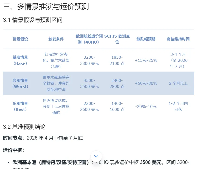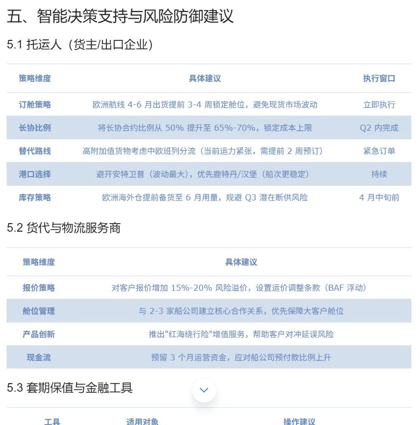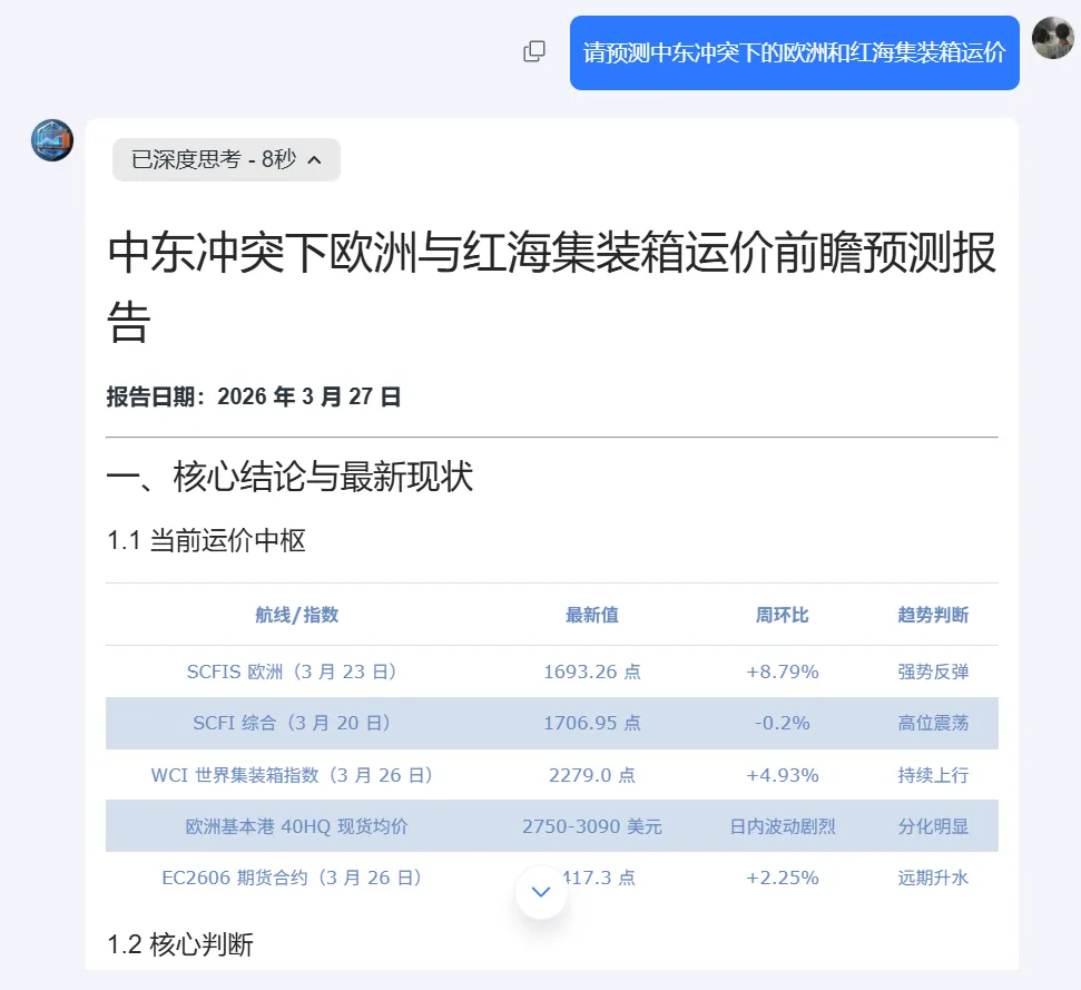 上面这份关于中东冲突下欧洲和红海集装箱运价的完整回答,从核心结论到归因分析,从多情景推演到拐点前瞻,从分层决策建议到具体的期货对冲操作——全部由【集装箱运价智能预判】智能体在几分钟内生成。