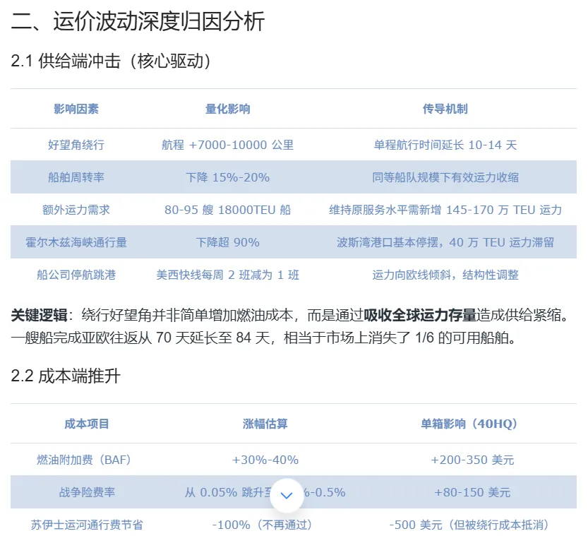 把供给端冲击、成本端推升、需求端支撑拆解得清清楚楚。它告诉你绕行好望角不是简单地增加燃油成本,而是通过吸收全球运力存量造成供给紧缩——一艘船完成亚欧往返从70天延长至84天,相当于市场上消失了1/6的可用船舶。