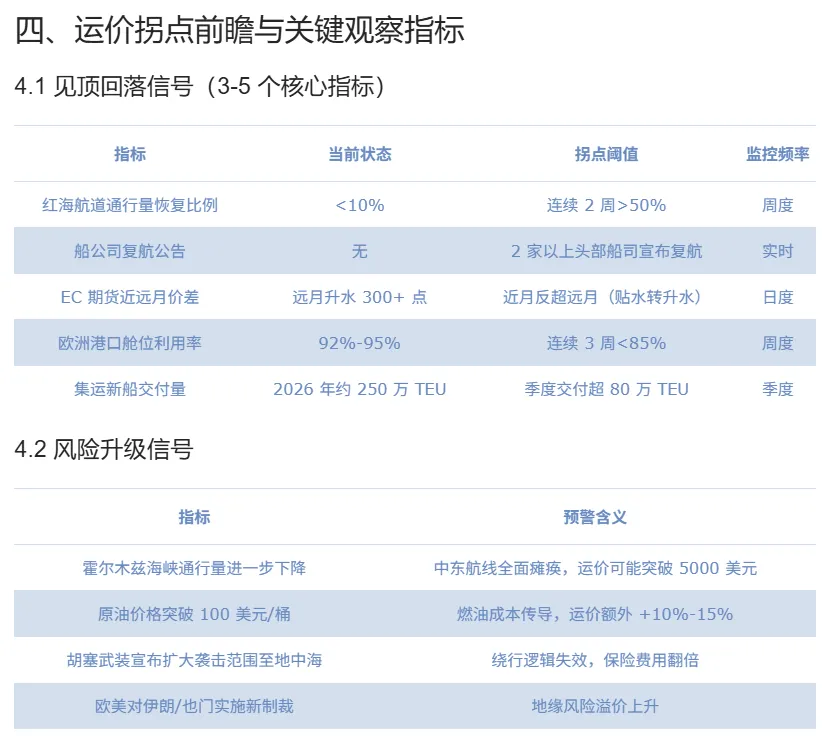告诉用户:如果你想判断运价什么时候见顶回落,盯住四个指标——红海航道通行量恢复比例、船公司复航公告、EC期货近远月价差、欧洲港口舱位利用率。每个指标都有当前状态、拐点阈值和监控频率。