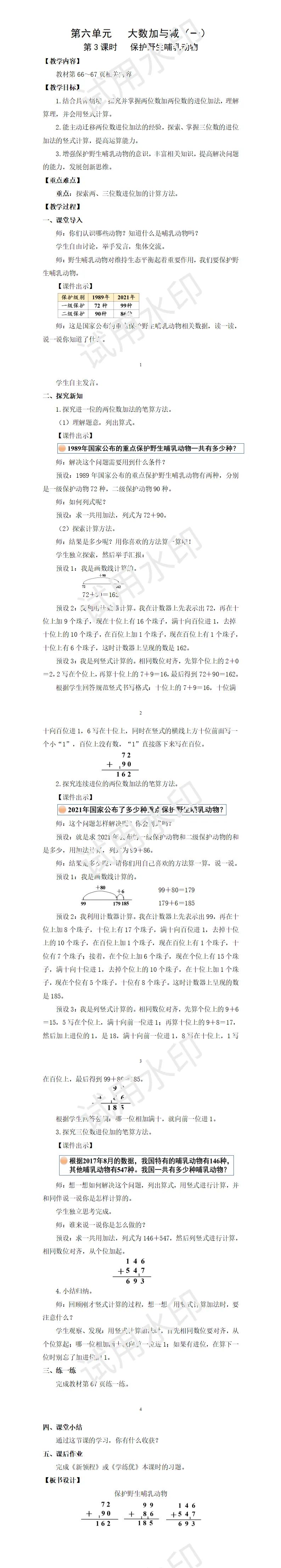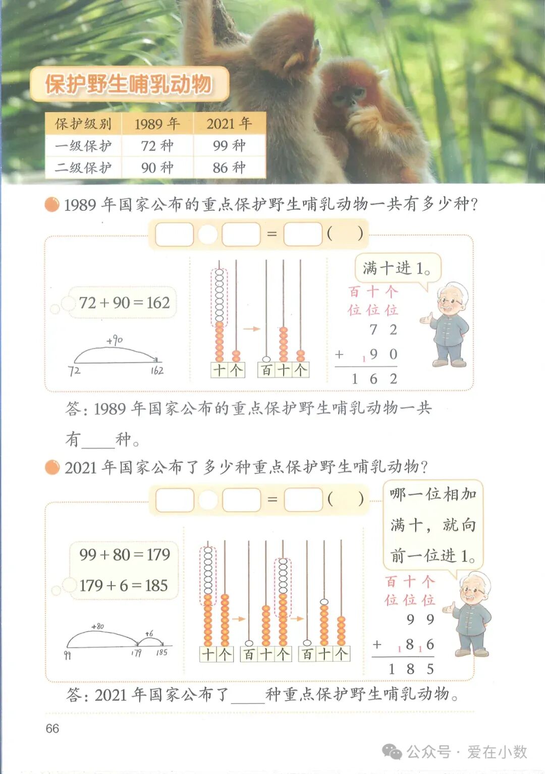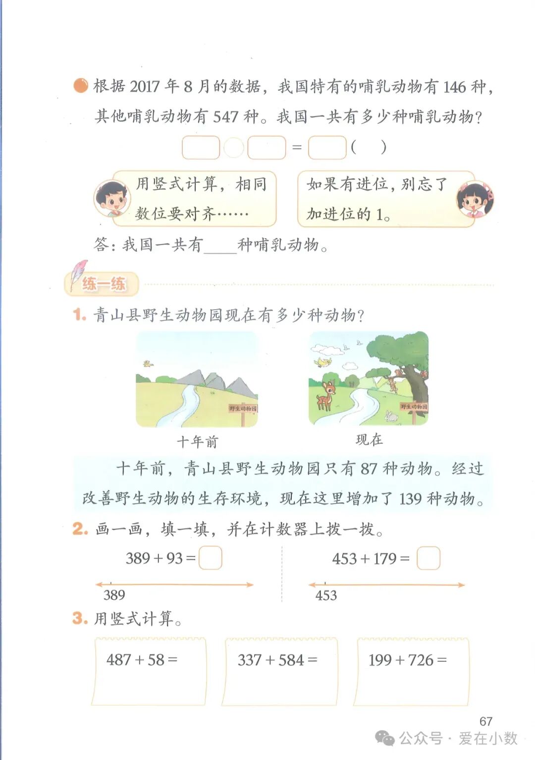 借助保护野生哺乳动物的情境,让学生去观察数学信息,解决数学问题,不仅激发了学生的兴趣,也渗透了环保意识。在提出问题后,鼓励学生运用多种方法进行计算,让他们在互相交流的过程中理解算理,并在此基础上归纳出竖式计算加法的注意事项,一方面强化了知识,另一方面发展了学生的归纳、总结能力。
