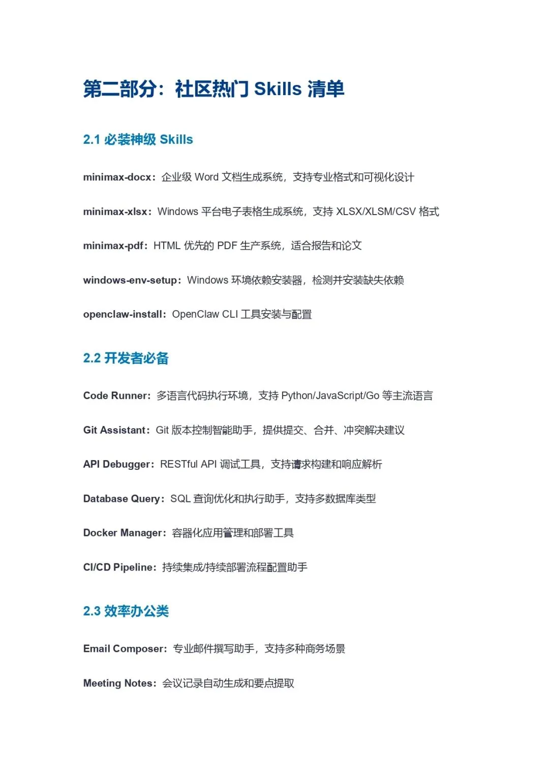 核心干货当属超全的社区热门 Skills 清单,按「必装神级 + 开发者必备 + 效率办公 + 学习科研 + 安全防护」五大分类精准划分,覆盖日常使用全场景,按需安装就能大幅提升效率。必装神级 Skills 包揽办公核心需求,docx/xlsx/pdf 三大文档生成系统适配专业格式,环境依赖安装、CLI 工具配置一键搞定,解决基础使用痛点;开发者必备 Skills 直击开发场景,代码执行、Git 管理、API 调试、Docker 部署等工具全覆盖,从编码到部署全流程赋能;效率办公、学习科研类 Skills 更是打工人和研究者的福音,邮件撰写、会议记录、论文辅助、数学求解等功能一应俱全,轻松实现提效减负;安全防护类 Skills 则为使用保驾护航,密码生成、安全审计、钓鱼识别、数据加密等工具,全方位规避使用风险。