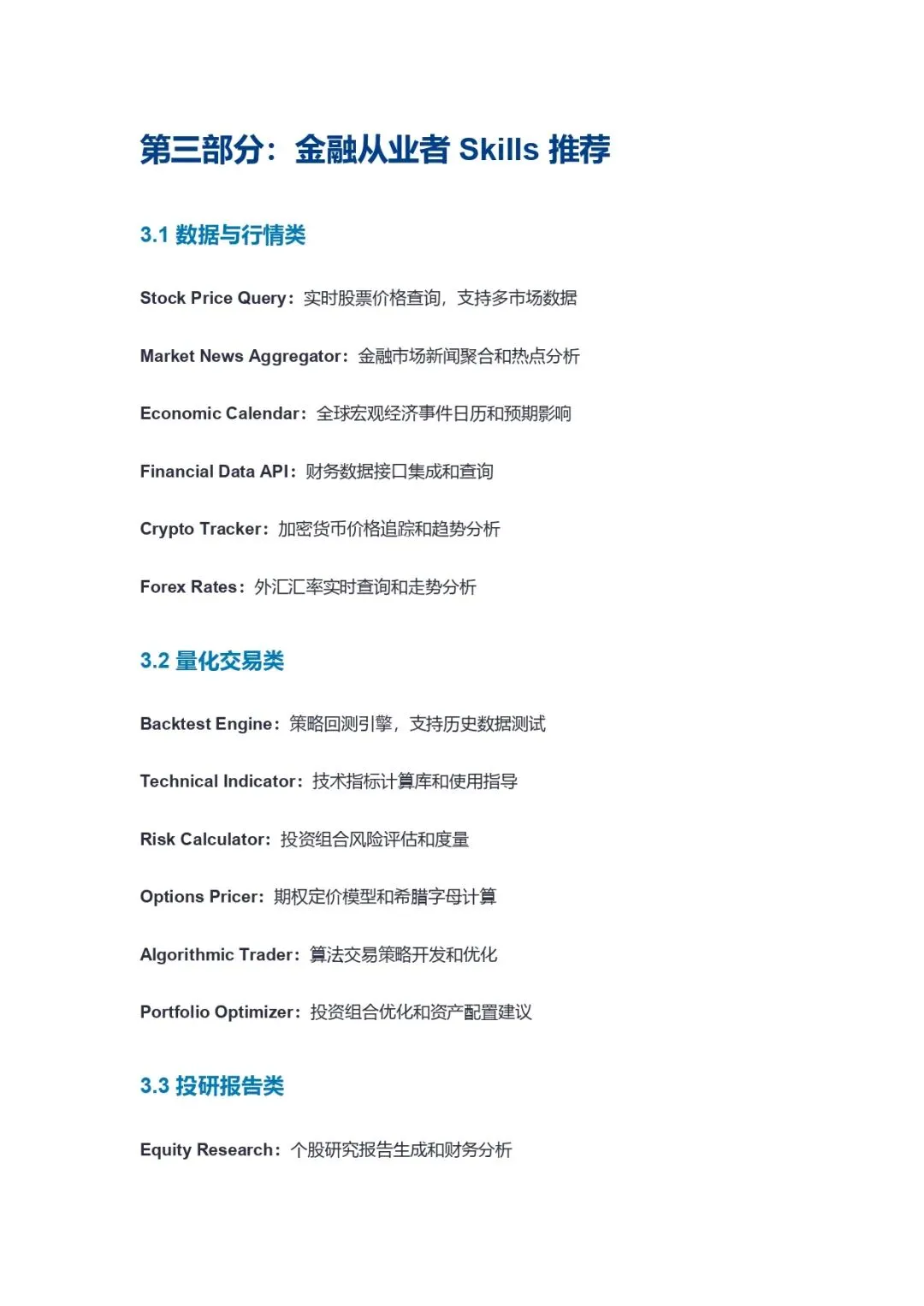 更贴心的是,这份技能大全专为金融从业者打造了定制化 Skills 推荐,六大分类精准匹配金融投研、交易全流程需求,堪称金融人的 AI Agent 专属外挂!数据与行情类能查实时股价、聚合市场新闻、追踪加密货币;量化交易类支持策略回测、风险评估、投资组合优化;投研报告类可自动生成个股 / 行业研报、做 ESG 评估和同业对比;还有财务建模、估值分析、情绪监测等分析工具,以及订单执行、交易机器人开发、套利检测等自动化交易工具,从数据查询到策略开发,从报告撰写到交易执行,全链路覆盖金融工作核心场景。