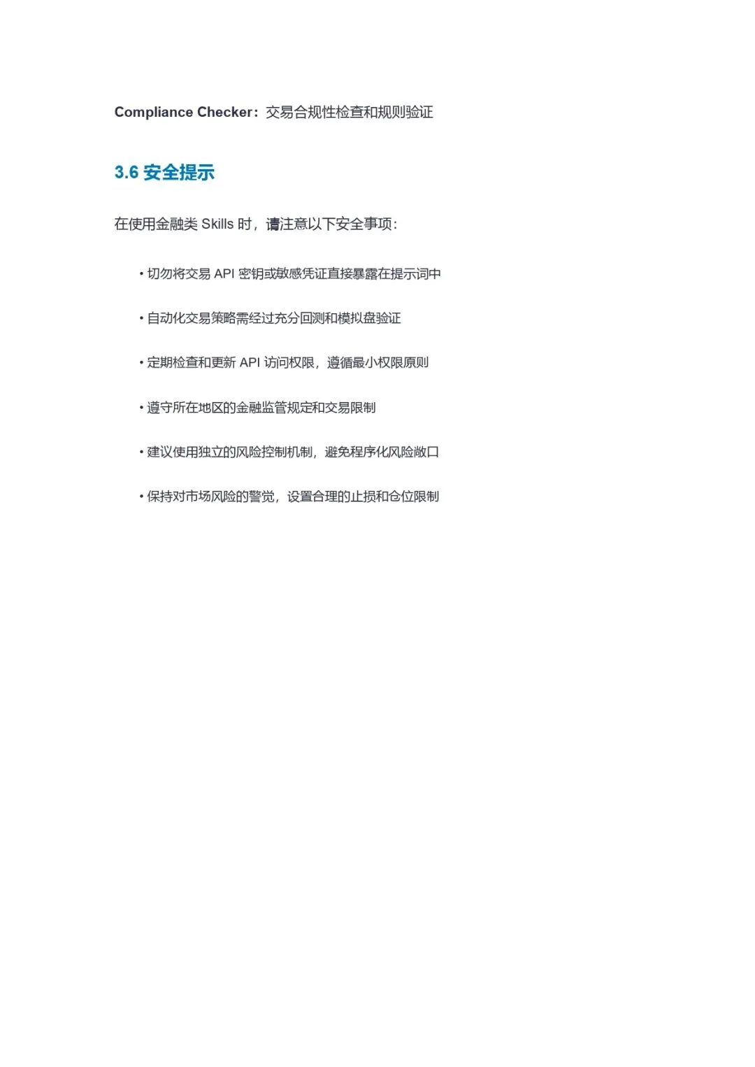 同时,手册还附上了金融类 Skills 使用的专属安全提示,重点提醒 API 密钥保护、策略回测验证、合规交易等关键事项,让高效使用的同时,牢牢守住安全底线,避免各类金融风险和数据泄露问题。