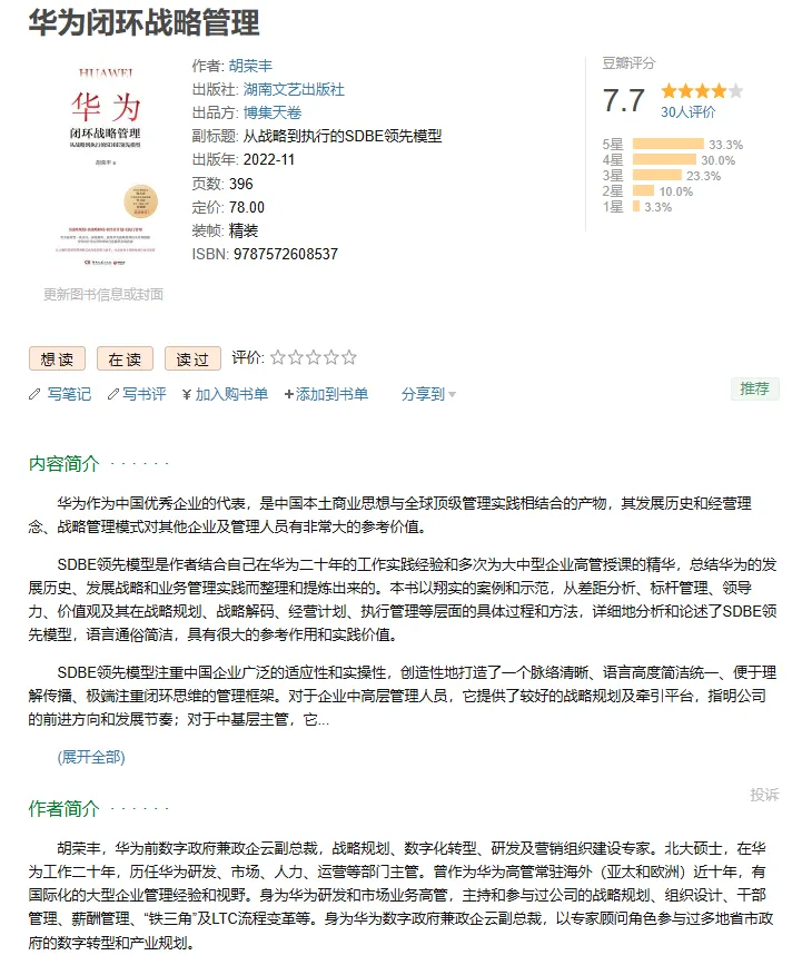 《华为闭环战略管理》PDF电子资料分享点击上方蓝字 关注我,获取更多电子书分享 | 本期书单电子版下载方式见文末 ~作者: 胡荣丰出版社: 湖南文艺出版社出品方:博集天卷副标题: 从战略到执行的SDBE领先模型出版年: 2022-11ISBN: 9787572608537特别声明:图片和资料来源于网络,版权归原作者所有,若有侵权,请联系告知,删除相关信息本期书单电子书下载链接,点击文章末尾左下方阅读原文自动跳转。特别提醒:电子书仅供个人学习使用,链接随时失效,请及时转存至个人网盘哦~
