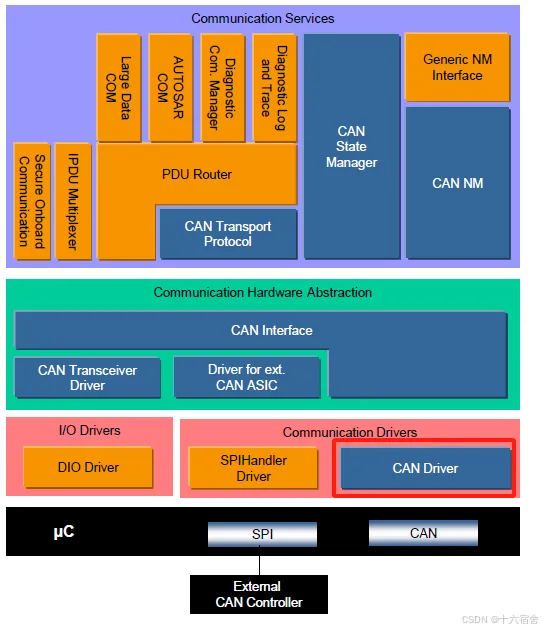 Can驱动模块规范规定了AUTOSAR基本软件模块CAN驱动程序的功能、API和配置(本文称为“CAN模块”)。Can模块是CAN栈中最低层的一部分代码实现,它用来执行具体的硬件访问,并为上层提供一个与硬件无关的API。唯一可以访问Can模块的上层是Canlf模块。CAN模块提供发送/接收CAN帧的服务,并调用CanIf模块的回调函数来通知事件,这独立于硬件。此外,它还提供分别控制同一CAN硬件单元中CAN控制器的行为和状态的服务(多个CAN控制器可以由单个CAN模块控制,只要它们属于同一个CAN硬件单元,由一个Can驱动进行管理)。