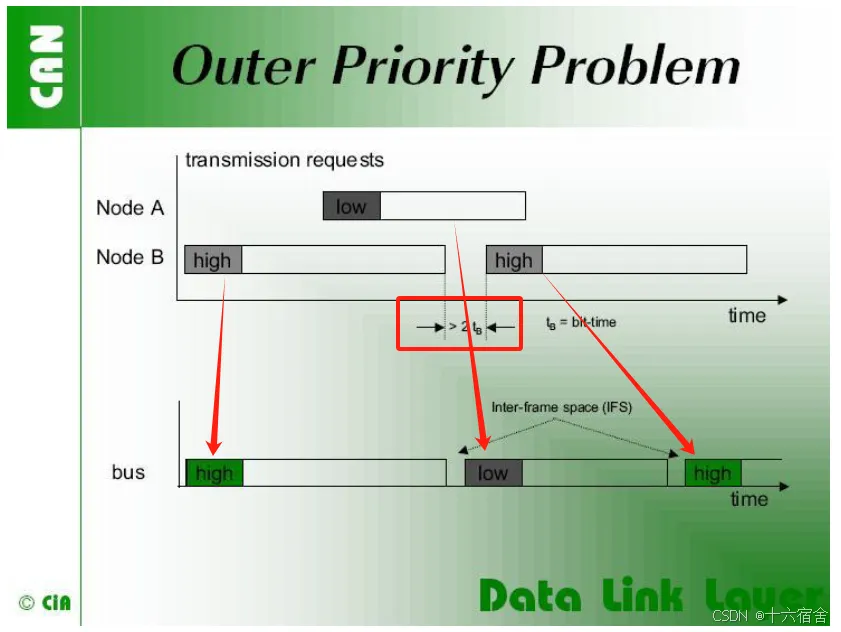 Outer Priority Inversion:外部优先级反转,指的是由于在两个连续发送的L-PDU之间会出现时间间隔,当此时另一个节点优先级较低的L-PDU尝试发送报文,并赢得了仲裁之后,则可以阻止本节点发送自己优先级较高的L-PDU。