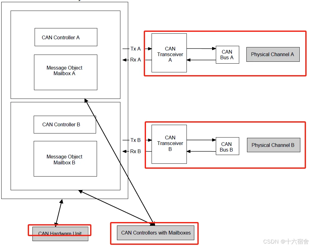 CAN硬件单元将一个或多个CAN控制器与公共或独立的硬件对象结合在一起,这些控制器可以位于芯片上或作为同类型的外部独立设备。下图显示了一个CAN硬件单元,该单元由分别连接到两个物理通道的两个CAN控制器组成。
