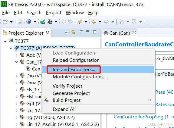 首先,Can驱动作为MCAL的一个模块,我们可以采用手动配置的方式,但是工作量较大,一般采用的直接导入ISOLAR生成的arxml文件,首先打开对应的MCAL工程,选择im-and Exporters选项,如下图。