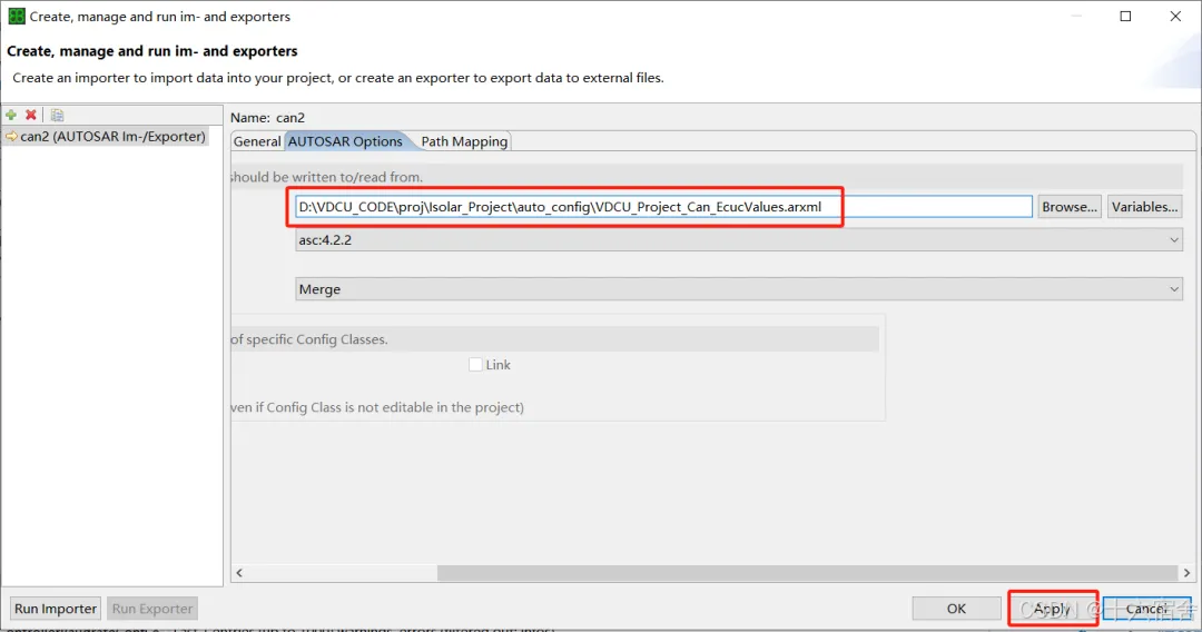 然后我们选择AUTOSAR Options页签,将生成的ISOLAR生成的CAN模块的ARXML导入,即可。注意:导入过程会将我们手配的一些参数覆盖,如果不一致需要我们手动复原。