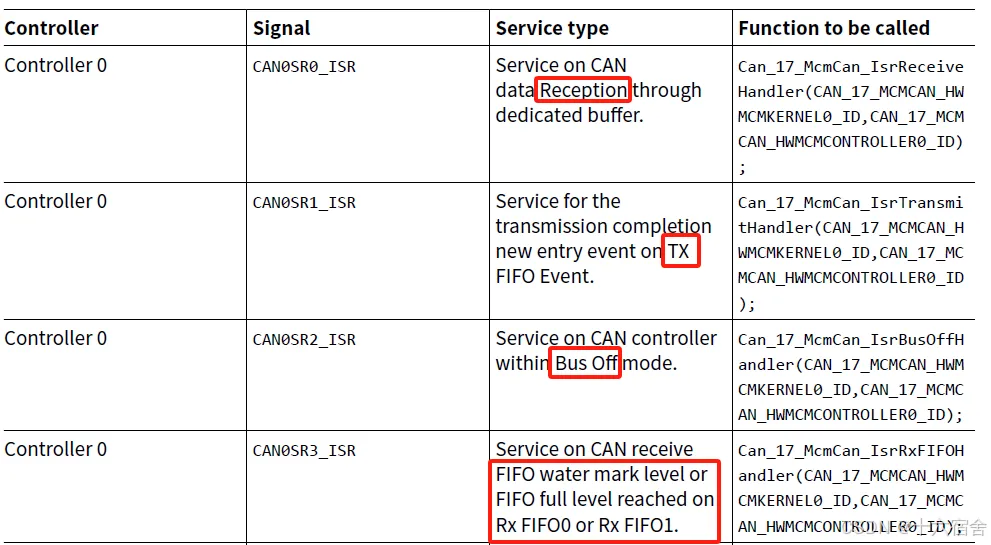 然后,CAN驱动还会依赖一些驱动服务。函数Can_Init应初始化CAN控制器使用的所有片上硬件资源。唯一的例外是数字I/O引脚配置(用于CAN的引脚),这由端口驱动程序完成。在初始化Can模块之前,应先初始化Mcu模块,MCU驱动模块提供一些例如时钟等通用的功能配置给到CAN驱动。如果使用外部CAN控制器,则CAN模块应使用其他MCAL驱动程序(例如SPI)的服务。CAN驱动的实现还依赖ISR模块,我们应该正确的分配CAN控制器对应节点的中断优先级情况。一个CAN控制器对应了四个中断(分别对应接收,发送,BusOff,接收FIFO中断),如下图。