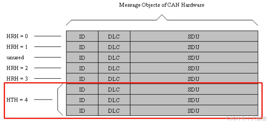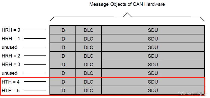 Hardware Transmit Handle (HTH):硬件发送句柄(HTH)由CAN驱动程序定义和提供。每个HTH可以代表一个或多个硬件对象(多路传输),这些对象被配置为硬件传输缓冲池。