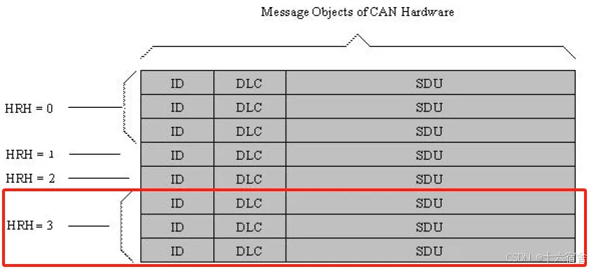 Hardware Receive Handle (HRH):硬件接收句柄(HRH)由CAN驱动程序定义和提供。每个HRH通常只代表一个硬件对象,也可以表示硬件对象的集合(接收FIFO)。HRH可用于优化软件过滤。