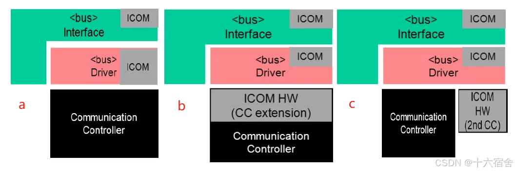 Intelligent Communication Controllers(智能通信控制器,ICOM)的实施支持这些功能(没有强制性的特定硬件实现)。基于车辆状态,如果ECU的某些或全部功能暂时不需要,ECU可以进入“虚拟联网”模式。在此模式下,MCU和/或外围设备被切换到低功耗模式。只有ICOM和连接的收发器保持活动状态。当ICOM判断ECU需要恢复操作时,会生成唤醒事件,例如由总线上接收到消息引起。根据ICOM的实现方式,接收到消息的报文ID和有效载荷可能在硬件中完全进行评估和过滤,或者在软件中需要回调机制。如下图所示,ECU的实现可以分为三种可能的变体:第一种软件方法a,没有特定的硬件来利用实现虚拟网络。方法b描述了基于通信控制器的功能硬件扩展实现,方法c显示了具有第二个扩展通信控制器的硬件变体实现,用于唤醒处理。